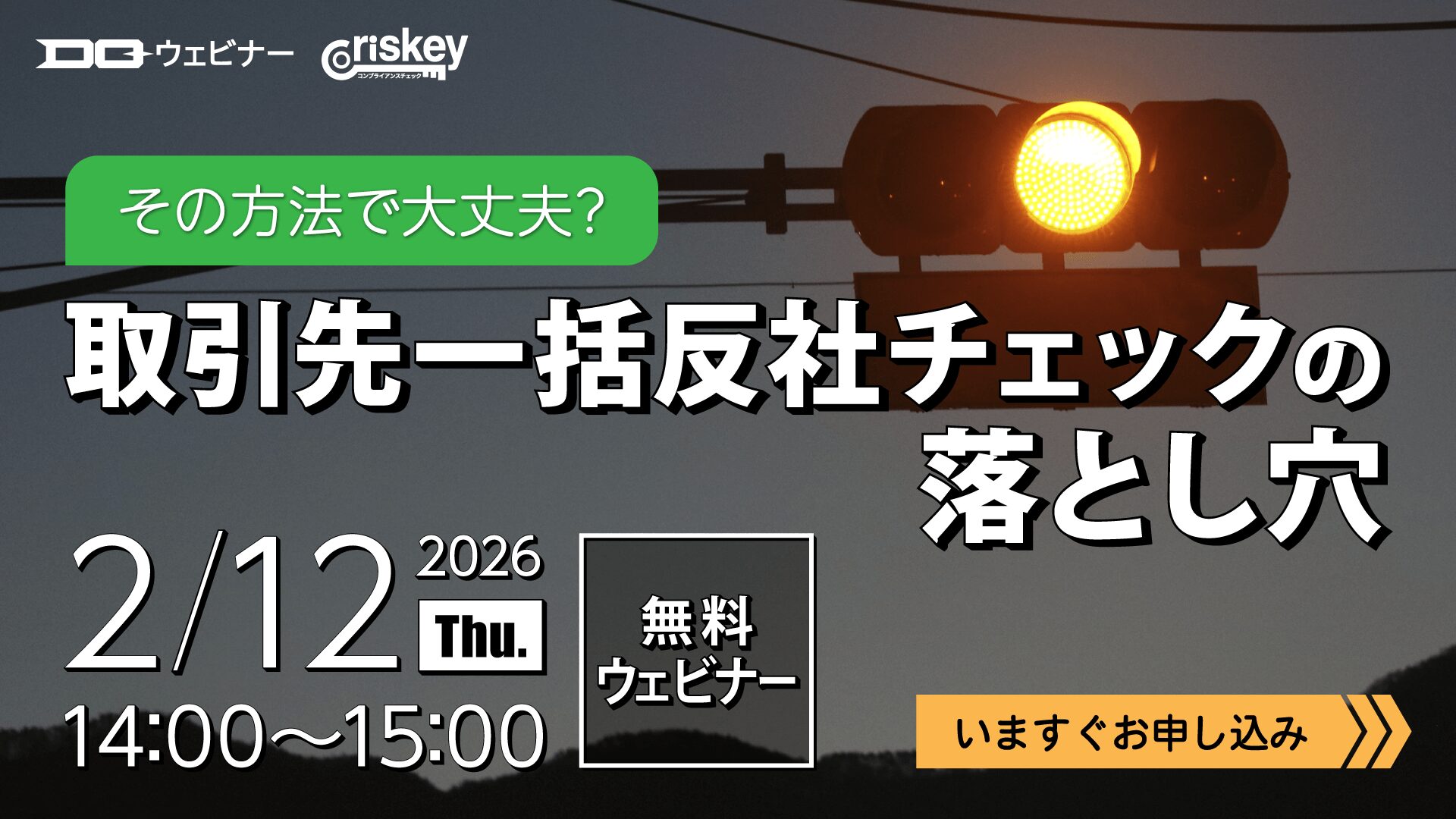 弊社ディー・クエストでは2026年2月12日(木)14時から、主にコンプライアンスおよびリスク管理部門ご担当のみなさんに向けた無料ウェビナー《その方法で大丈夫? 取引先一括反社チェックの落とし穴》を開催します。当日に先立って、弊社の考え方などを簡単な記事にしました。お申し込み前にご一読いただけると幸いです(記事下の画像・URLから申込ページに移動できます)。