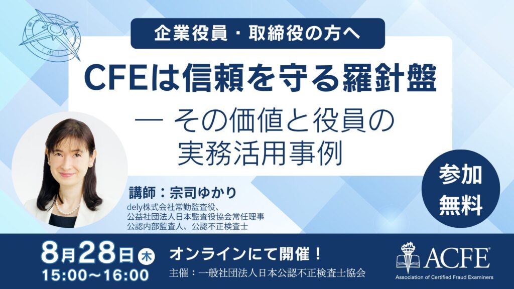 わが国唯一の不正検査・教育の専門機関、日本公認不正検査士協会(ACFE JAPAN)は、2025年8月28日木曜日15時から無料ウェビナー「CFE(公認不正検査士)は信頼を守る羅針盤~その価値と役員の実務活用事例~」を開催します。