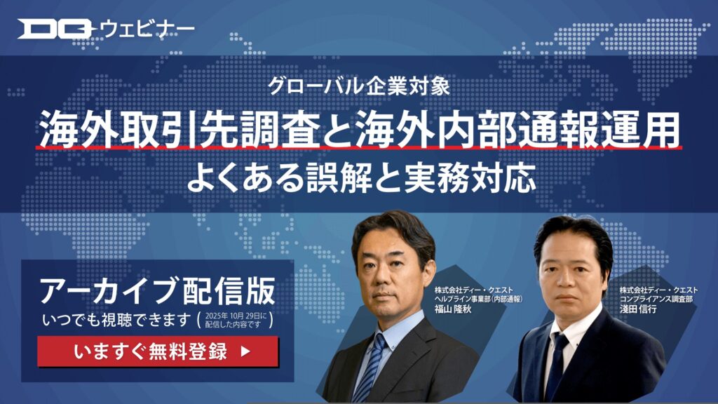 海外事業を展開する企業にとって、信頼できる取引先の選定と、健全な内部通報制度の運用は不可欠です。そこで、長年にわたりコンプライアンスチェックに代表されるリスク調査と内部通報制度の設置・運用を支援してきたディー・クエストの担当者が、海外取引先調査と海外内部通報運用における「よくある誤解」と、その実務対応の具体的なポイントをわかりやすく解説します。