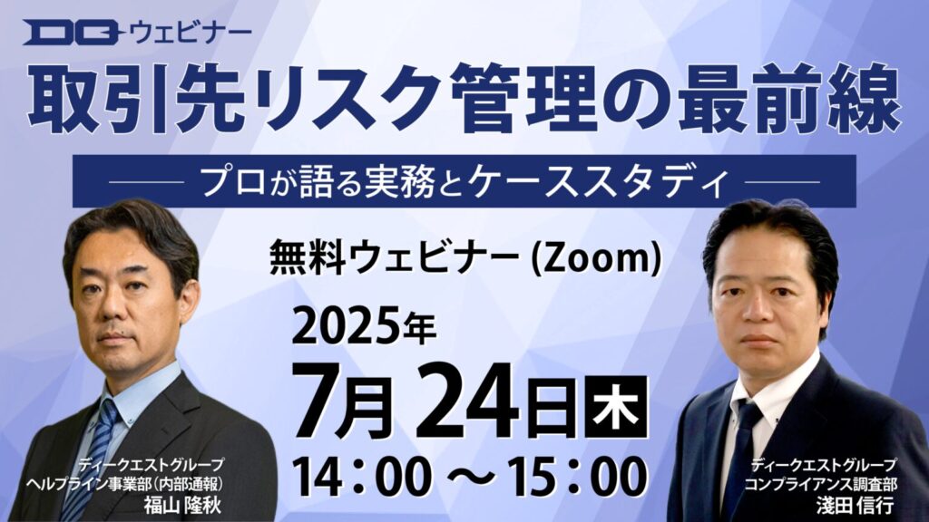 そこで、コンプライアンス調査と取引先窓口設置・運用サービスを提供するディークエストグループは、2025年7月24日木曜日14時から「取引先リスク管理の最前線:プロが語る実務とケーススタディ」と題した無料ウェビナーを開催します(受付終了しました)。