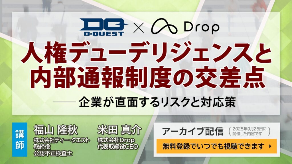 内部通報制度の専門事業者として20年余りサービスを提供してきたディー・クエストは2025年9月、株式会社Dropの共催で、グローバルな経営環境における人権デューデリジェンス(人権DD)と内部通報制度に焦点を当てたセミナーを開催しました。