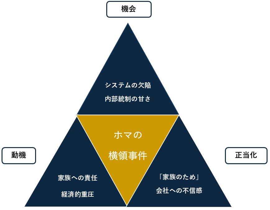 ライアン・ホマの不正行為を「不正のトライアングル」に当てはめ、インタビューでの発言をこれらの要素に照らし合わせてみよう。ホマの不正を振り返ると、彼の行動もまさに不正のトライアングルの枠組みに合致している。