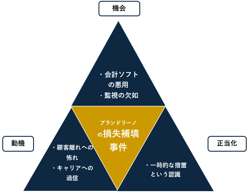 ブランドリーノの不正行為を、クレッシーの「不正のトライアングル」に照らし合わせると、単なる金銭的欲望だけでなく、主にプレッシャーから生まれた動機、金融業界での立場を利用した機会、そして「不正は一時的なもの」と信じた自己正当化によって進行していったと分析できる。