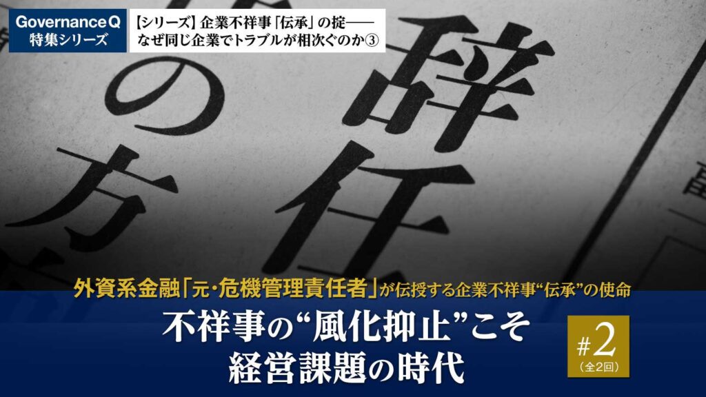 #1記事で、昨今の「行政・司法リスク」の高まりを受けて、不祥事を引き起こした企業は、その実像をこれから入社してくる後進を含めて社内外で共有し、 “伝承”していく必要性を語った外資系金融グループで危機管理対応の元責任者、白井邦芳・社会構想大学院大学専任教授。しかし、公益通報者保護法改正など、企業における不正・不祥事の代償はますます重くなっていくばかりだ。従来型の対応では、企業不祥事が免罪されない時代の再発防止、そして風化抑止の方策とは――。全2回の最終回。