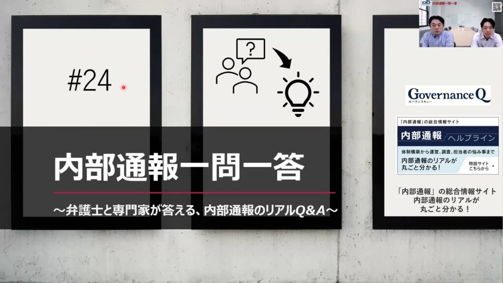 内部通報窓口の実務担当者や、コンプライアンス・人事・法務・監査部門など「現場で実際に内部通報に関わるすべての方」のための実践Q&Aの動画配信連載。第24回は以下の2つの一問一答です(動画は約20分)。