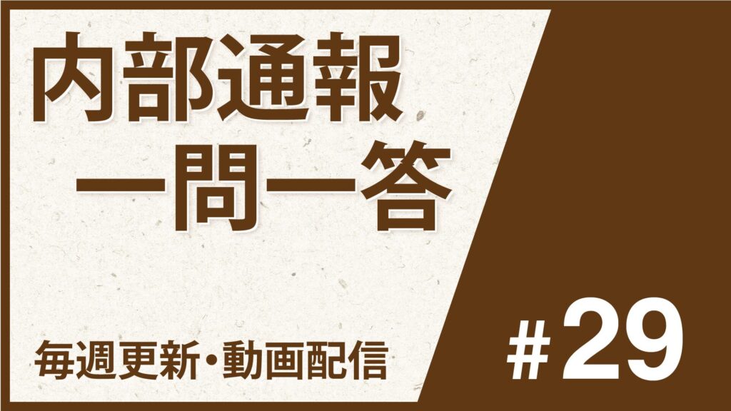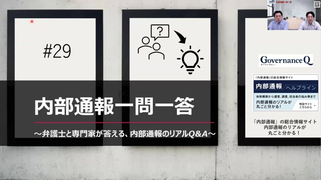 内部通報窓口の実務担当者や、コンプライアンス・人事・法務・監査部門など「現場で実際に内部通報に関わるすべての方」のための実践Q&Aの動画配信連載。第29回は以下の2つの一問一答です(動画は約15分)。