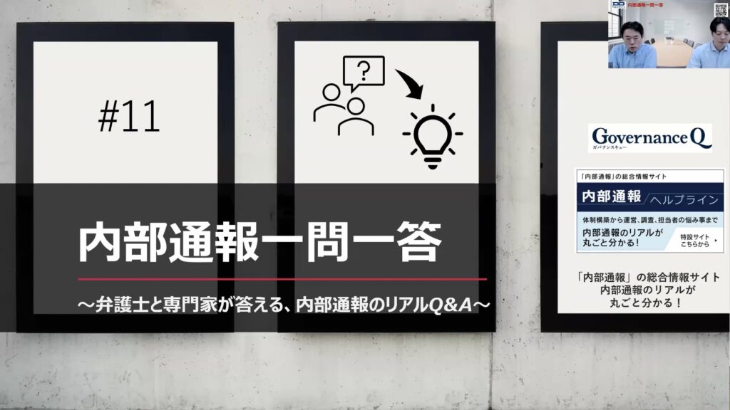 内部通報窓口の実務担当者や、コンプライアンス・人事・法務・監査部門など「現場で実際に内部通報に関わるすべての方」のための実践Q&Aの動画配信連載。第11回は以下の2つの一問一答です(動画は15分超)。