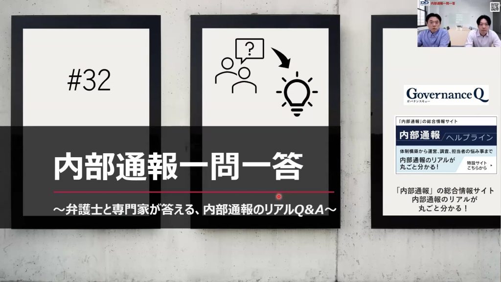 内部通報窓口の実務担当者や、コンプライアンス・人事・法務・監査部門など「現場で実際に内部通報に関わるすべての方」のための実践Q&Aの動画配信連載。第32回は以下の2つの一問一答です(動画は約10分)。